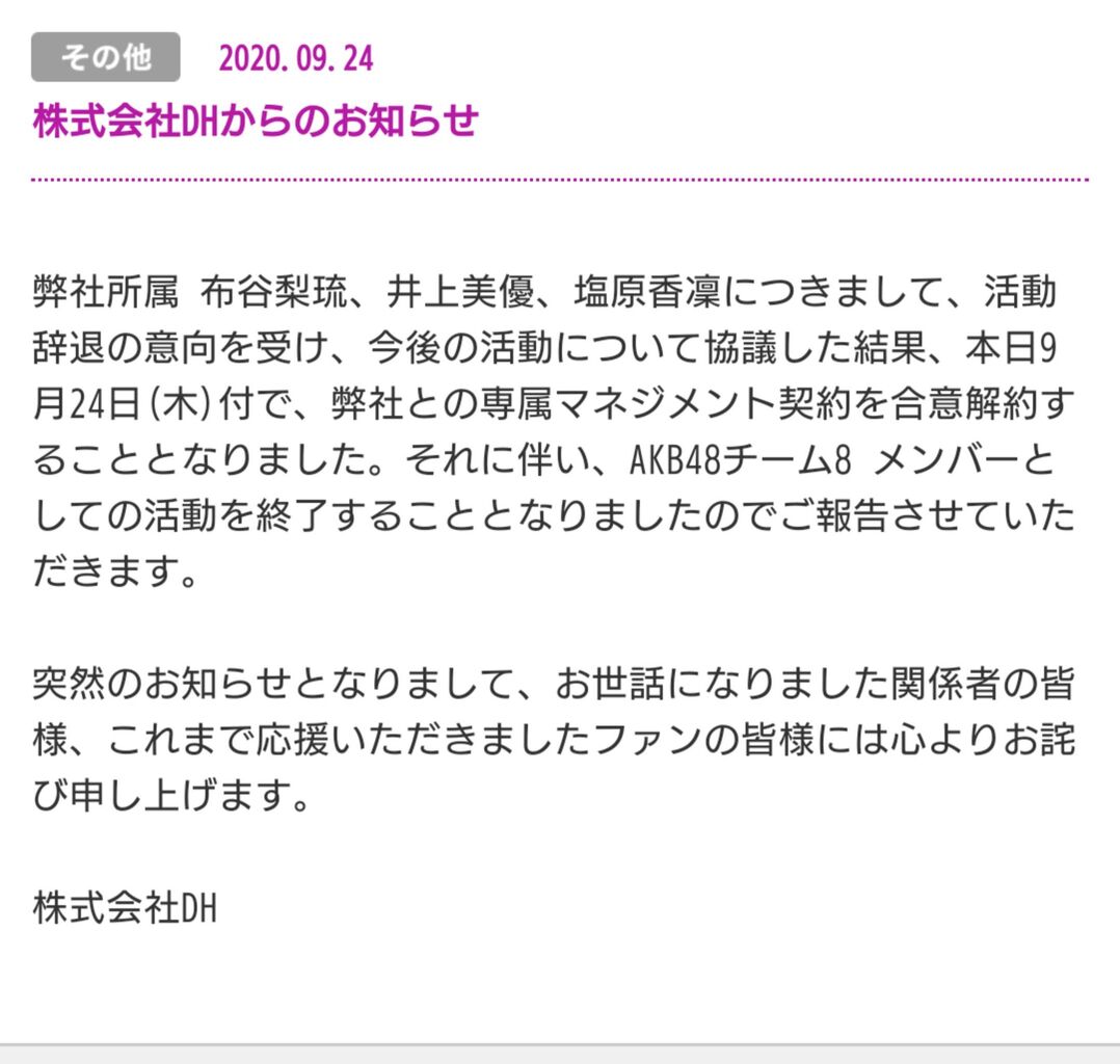 「それに伴い、AKB48チーム8メンバーとしての活動を終了することとなりましたのでご報告させていただきます。突然のお知らせとなりまして、お世話になりました関係者の皆様、これまで応援いただきましたファンの皆様には心よりお詫び申し上げます」とした。