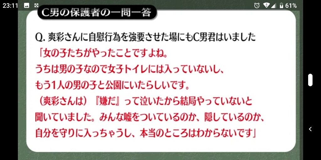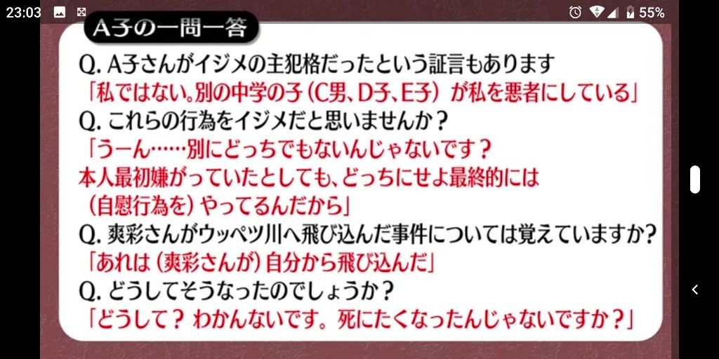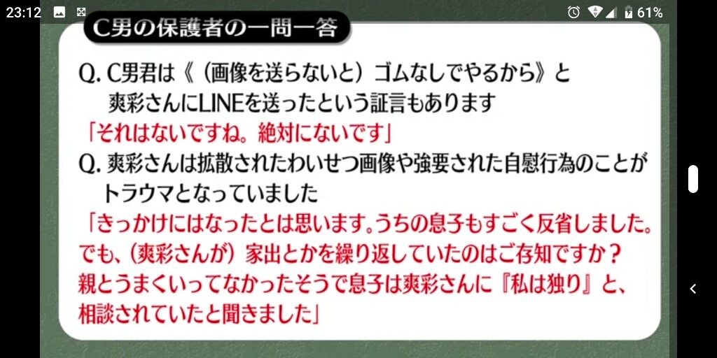 「だから指導しましたよ。その時にいたみんなに責任あるだろうということで。子供によっては、何を言ったか分かんないけど調子に乗って言ってたと言う子もいたり。ただ、学校としてはその時の場面だけが問題と捉えてなくて、夜中にLINEでやりとりしてたり、それこそ爽彩さんが出て行こうとしたりとかあった。