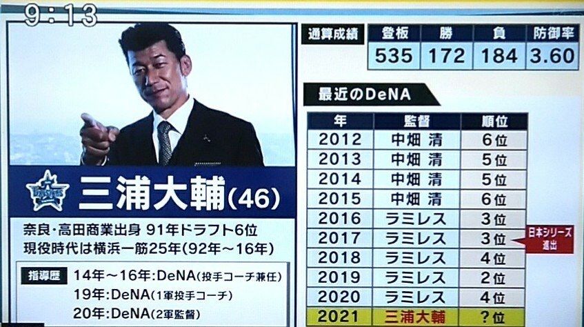最下位に沈むDeNAは21日の中日戦(横浜)も攻守に精彩を欠き、9連敗(引き分け2試合を挟む)を喫した。就任1年目の三浦大輔監督(47)にいきなりの試練。アレックス・ラミレス前監督(46)の功罪を問う声も球団の内外で上がっている。