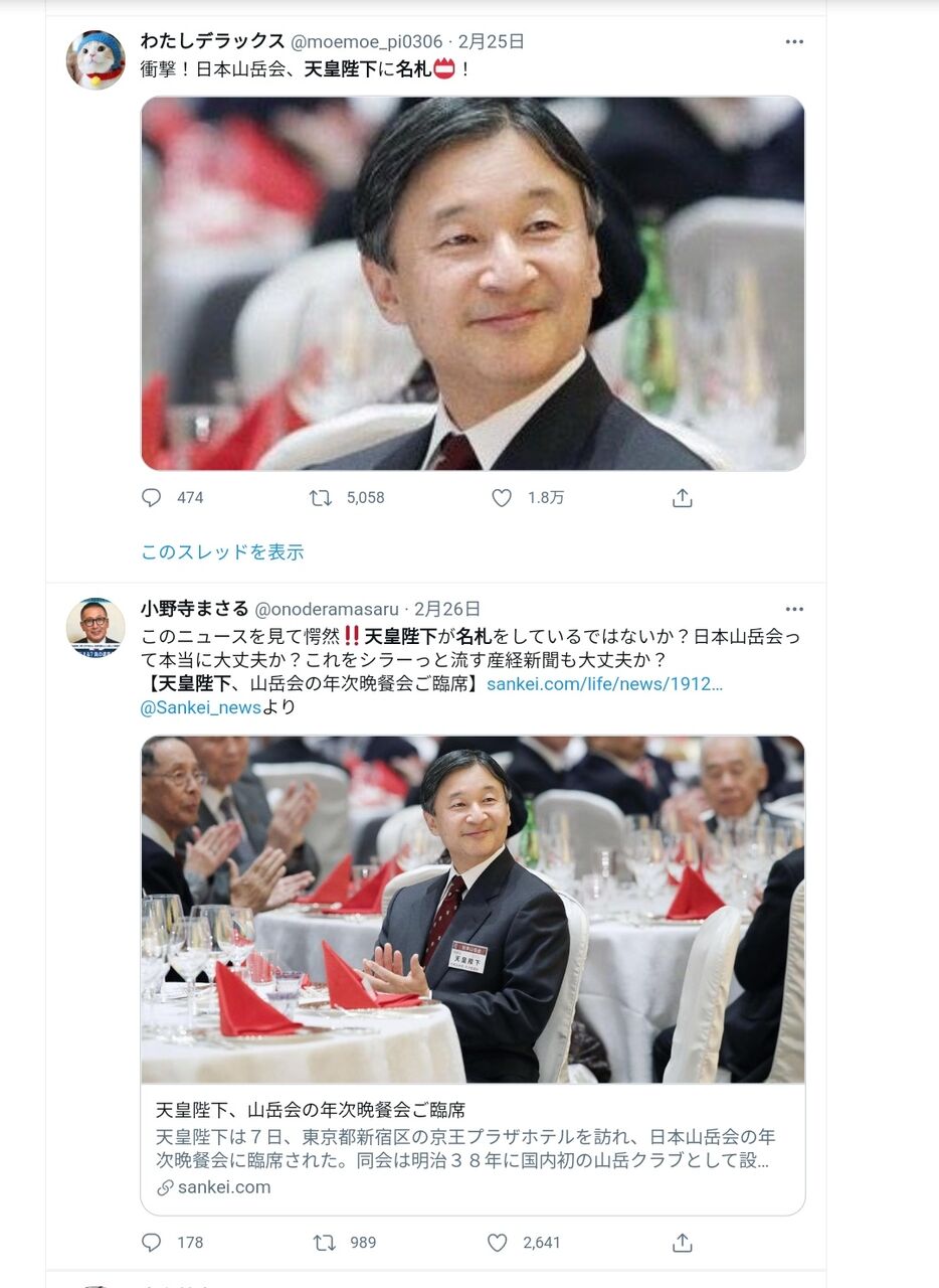 登山が趣味の陛下は昭和62年に会員となり、皇太子時代から折に触れ晩餐会などの行事に参加されているが、即位後は初めて。