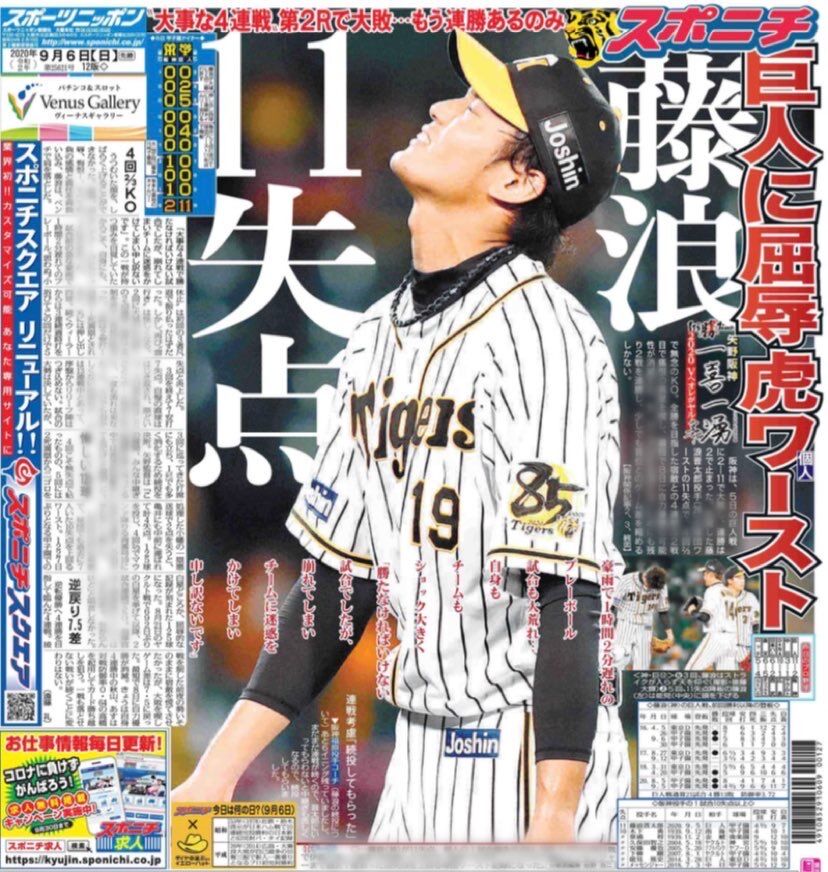 阪神の藤浪晋太郎投手が4回2/3を9安打、自己ワーストの11失点で降板。