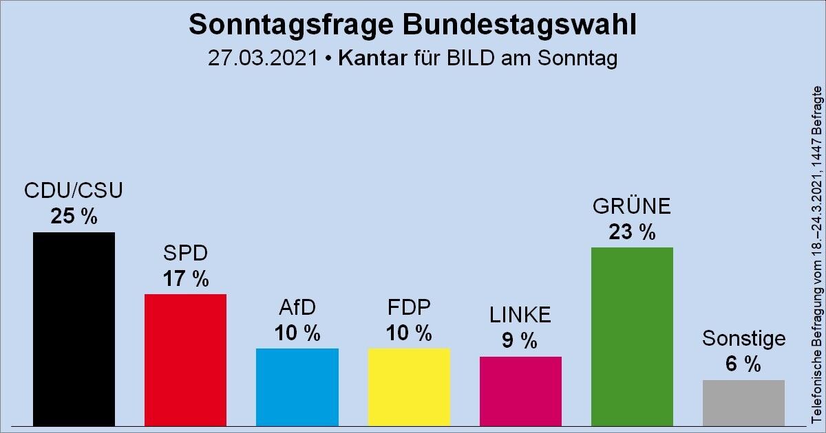 ドイツの連邦議会選挙(総選挙)が半年後に迫るなか、メルケル首相の与党、キリスト教民主・社会同盟(CDU・CSU)の支持率が急落している。新型コロナウイルスの感染が再び広がるなかでワクチンの市民への接種が遅れたことが響いており、メルケル首相への支持も落ち込んでいる。支持率2位の環境政党、緑の党との差は急速に縮まっており、総選挙後の政権交代シナリオも現実味を帯びてきた。