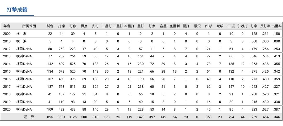 梶谷隆幸(32) .323(433-140) 19本 53打点 14盗塁 OPS.913