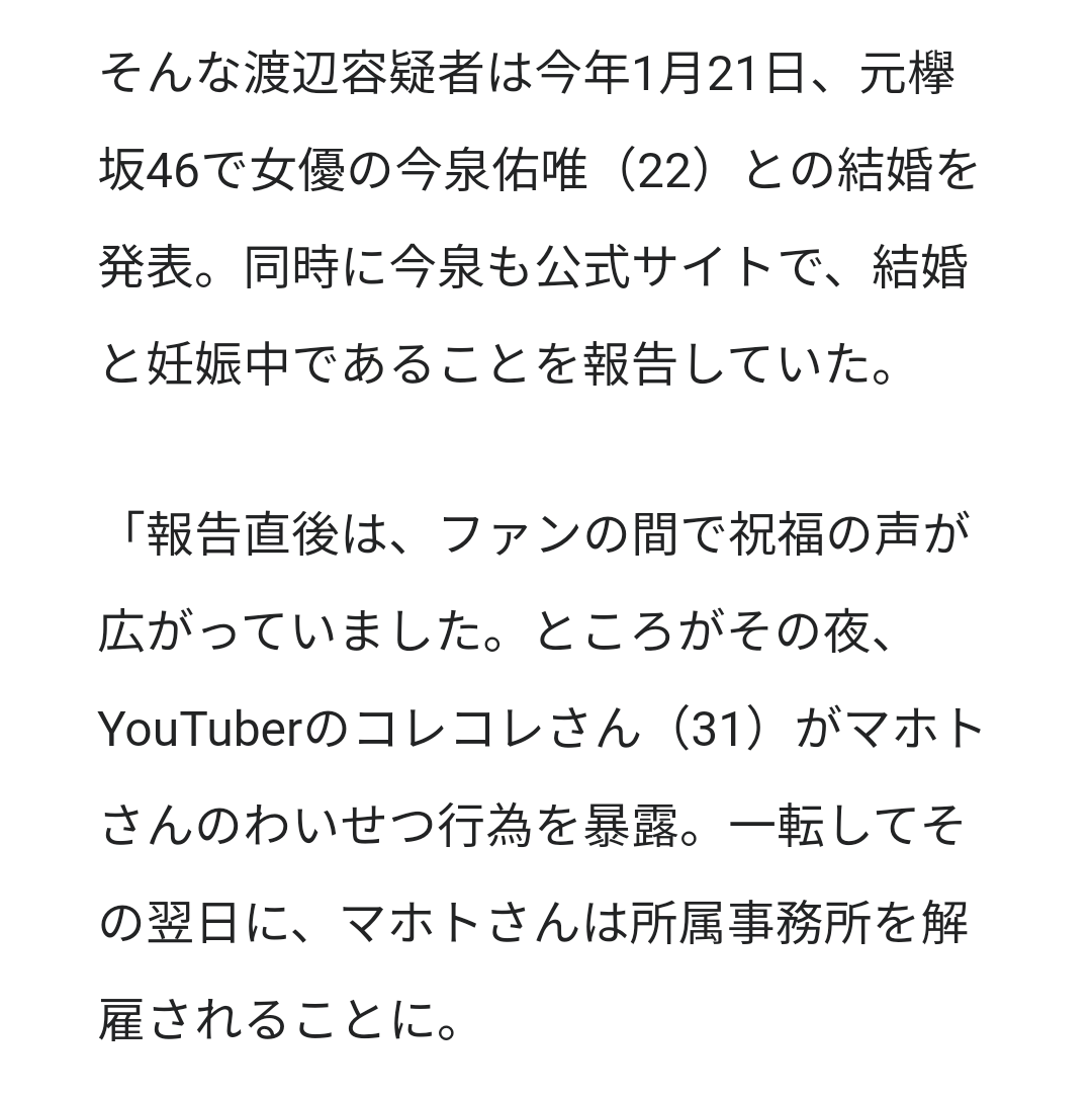 17日配信の「文春オンライン」の記事では、今泉の友人が、渡辺容疑者は今泉の出産に立ち会う予定だったと明かし「『結局、1人で産むしかないのか』と落ち込んでいます。さらに、マホトと縁を切らなかったことから『私まで所属事務所から見捨てられそう。芸能活動を続けられるのかな……』と嘆いていました」と今泉の現状について話している。さらに、今泉は渡辺容疑者の周囲から借金の返済を肩代わりすることを求められており、精神的に追い詰められているという。