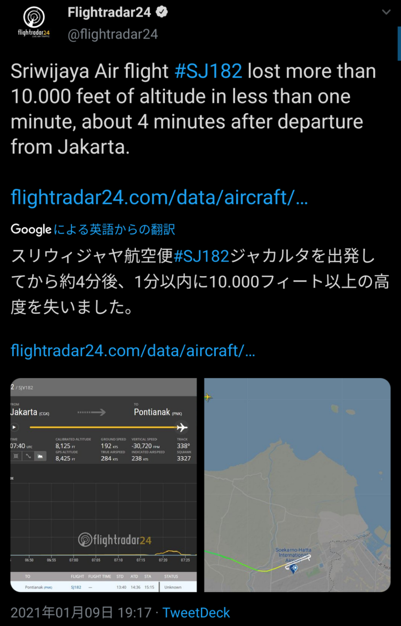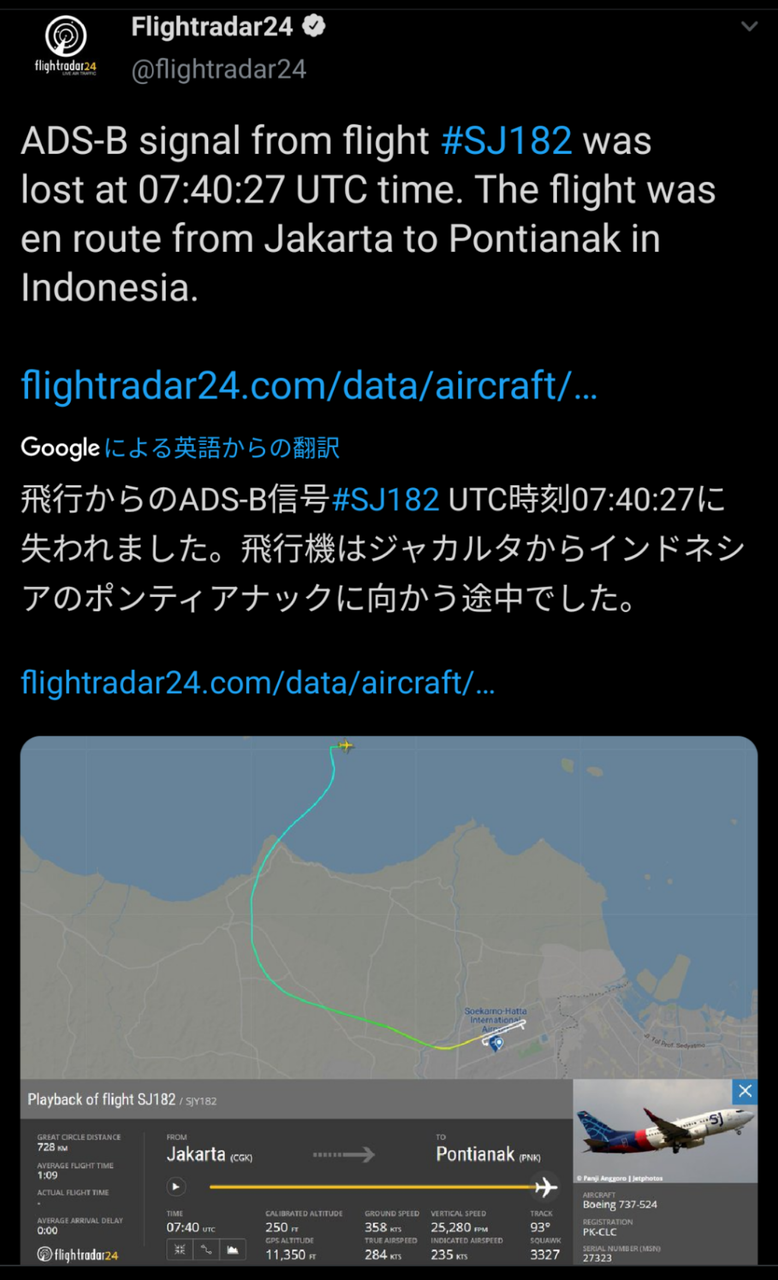 速報:スリウィジャヤ航空のボーイング737型機SJ182は、インドネシアのジャカルタから離陸した後、レーダーから姿を消しました。
