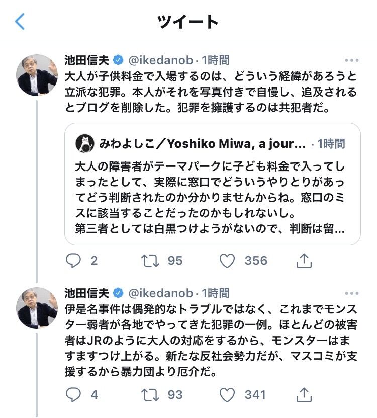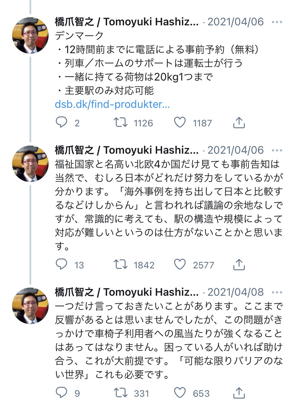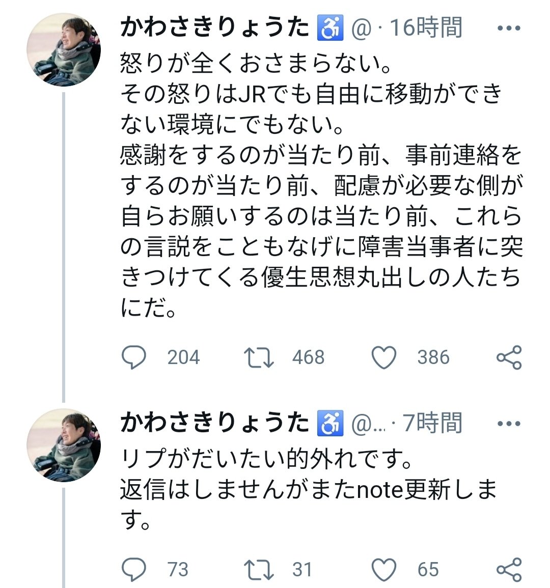 障害者とか健常者とかの問題では無いと思う。ただ我儘なだけ。それを障害者を隠れ蓑にして通そうとしてる。障害者という立場を悪利用していろのが怒りを通り越して悲しいです。重い車椅子を運んでいる画像を見て可哀想だし心配でした。もう二度と同じ事はしないでほしい。事故が起きたら取り替えしがつきません。