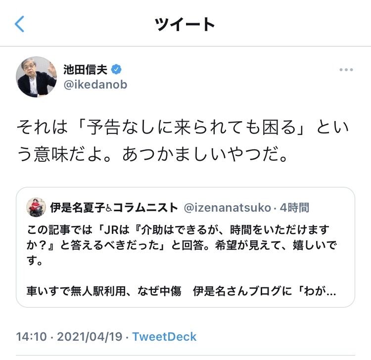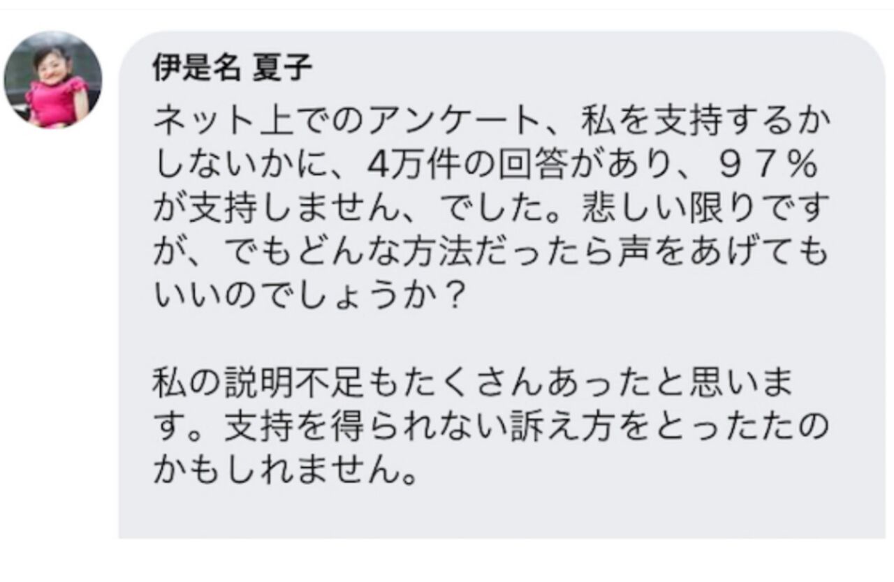 伊是名さんは先月4日、ブログで「JRで車いすは乗車拒否されました」と題した記事を投稿。車いす対応をめぐる駅員とのやりとりをつづり、物議をかもした。