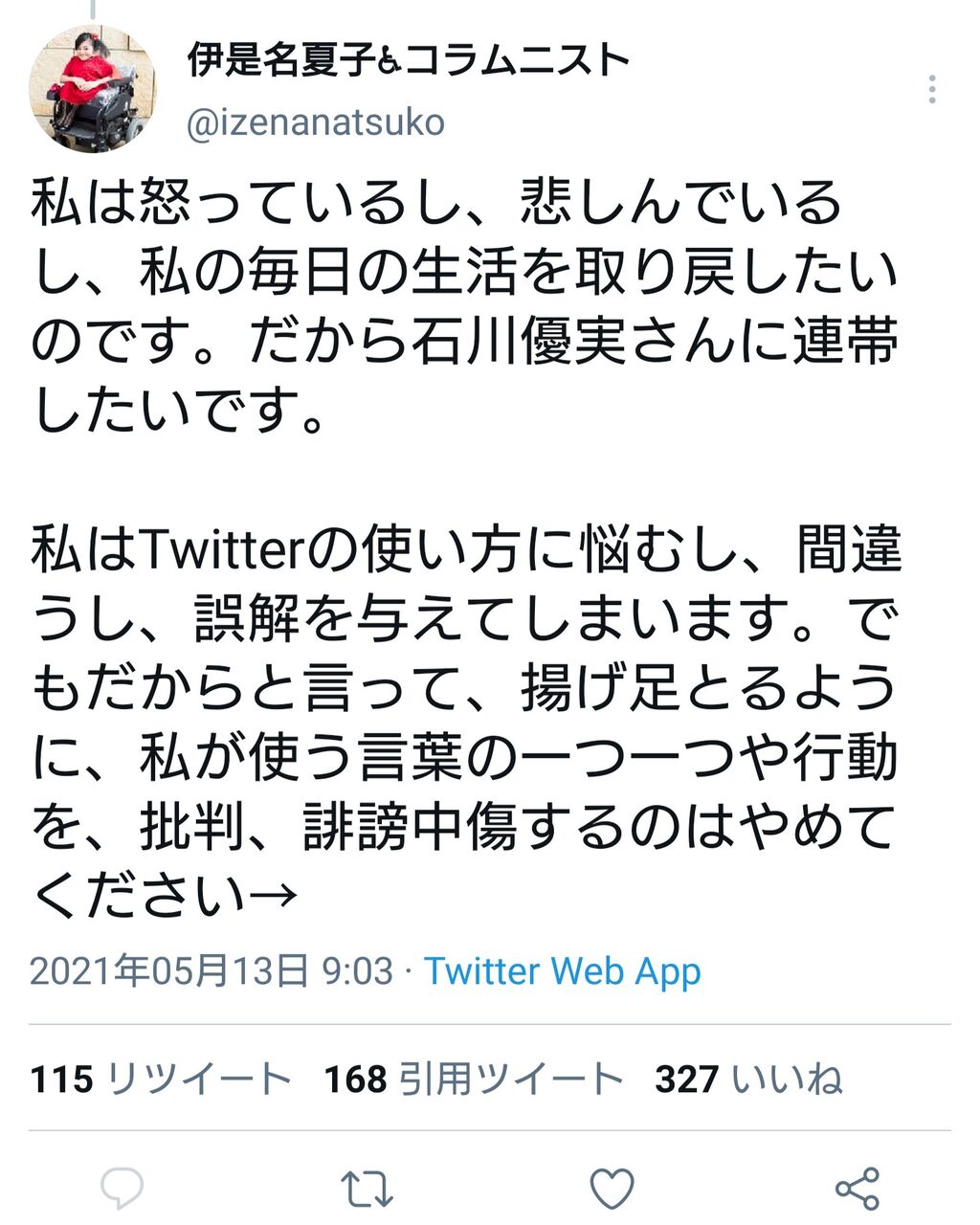 そうした悪質なツイートへの対処として、フォロワーらから「見なければいい」という助言も少なからず寄せられたという。しかし「それは違うと思ったのです。いじめられて、学校に行けない人に『学校に行かないくていいよ』というのと同じではないです?いじめるほうが悪いのに、どうして私が選択肢を奪われ、隠れて生活しないといけないのか」と疑問を投げかけ、「私はTwitterの使い方に悩むし、間違うし、誤解を与えてしまいます。でもだからと言って、揚げ足とるように、私が使う言葉の一つ一つや行動を、批判、誹謗中傷するのはやめてください」と求めた。