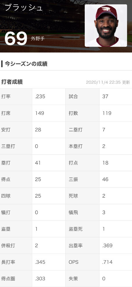 ブラッシュ.235 2 18 出塁率.369 OPS.714