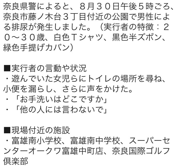 ◎発生状況:女子小学生ら4名が公園で遊んでいたところ、徒歩で公園に入ってきた犯人が「トイレはどこ」と声をかけ、手を差し出したもの。