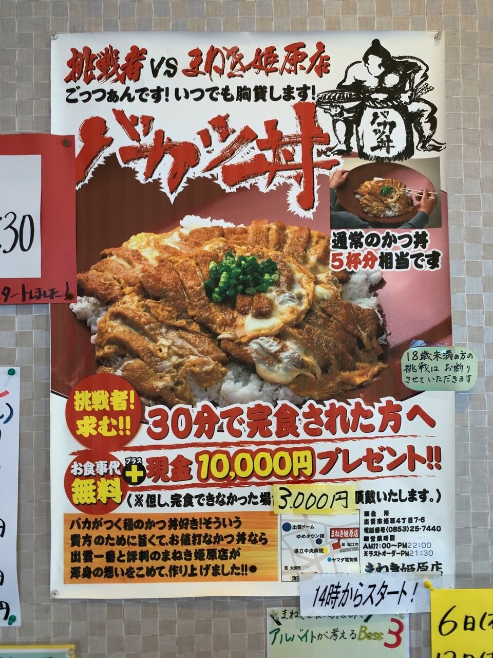 調べによりますと男は8日午後7時半頃、島根県出雲市内の飲食店で、制限時間30分以内に大盛りの「カツ丼」を食べる企画に挑戦しましたが失敗。