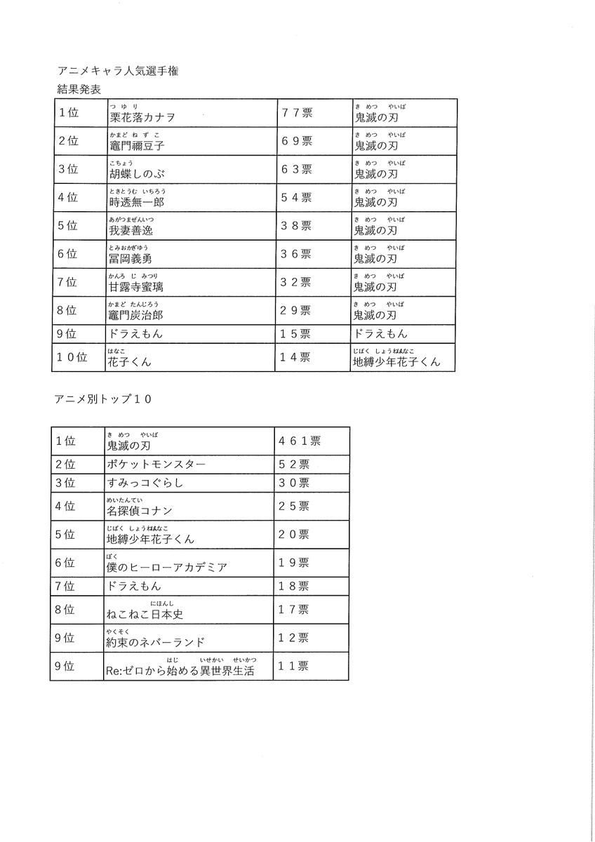 10位までのキャラと、アニメ別の結果は以下の通り