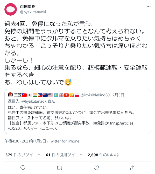 免停中に事故の都議「2日から運転できると勘違いした」 https://t.co/cuF3Yhvigu