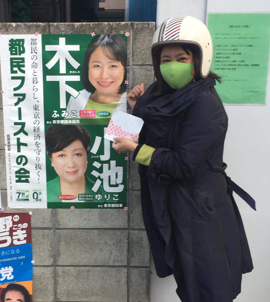 選挙期間前、期間中の両方で、木下都議が自ら車を運転して、二連ポスターの貼り替えや