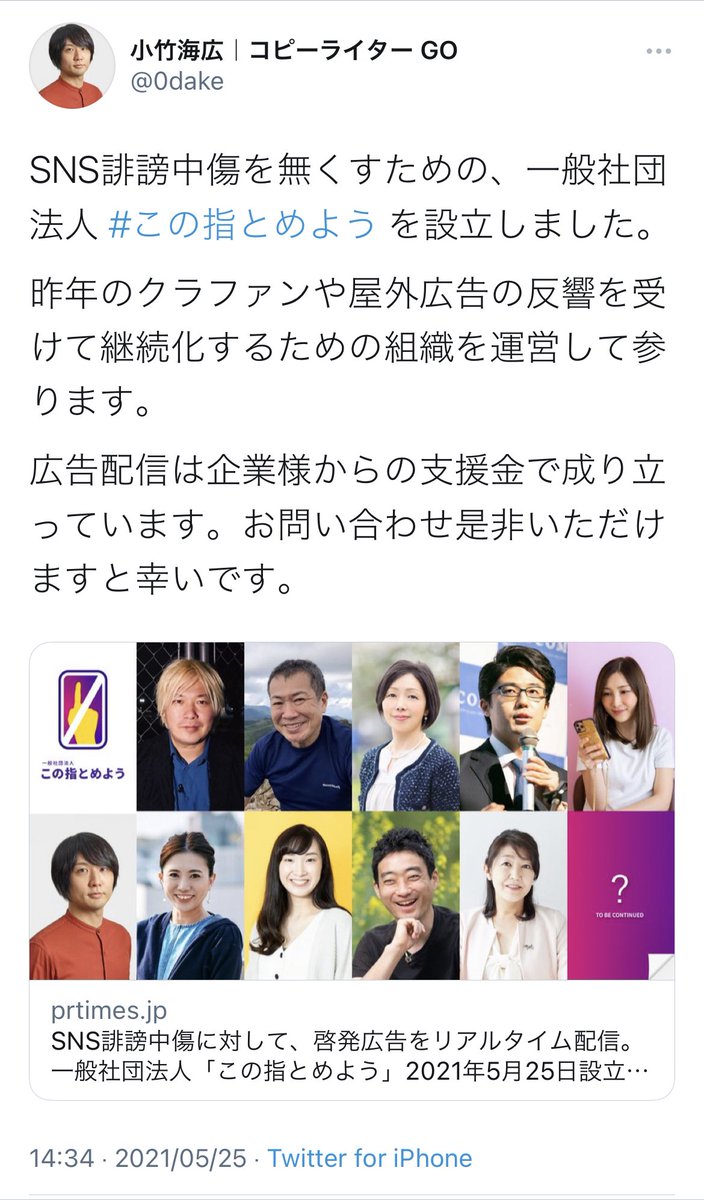 この団体は一般社団法人「この指とめよう」(東京)。広告・事業開発会社のコピーライター、小竹海広さんが発起人となった。
