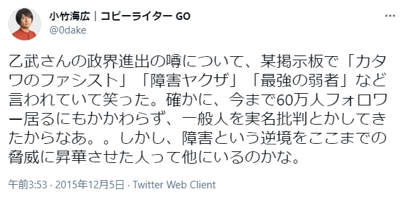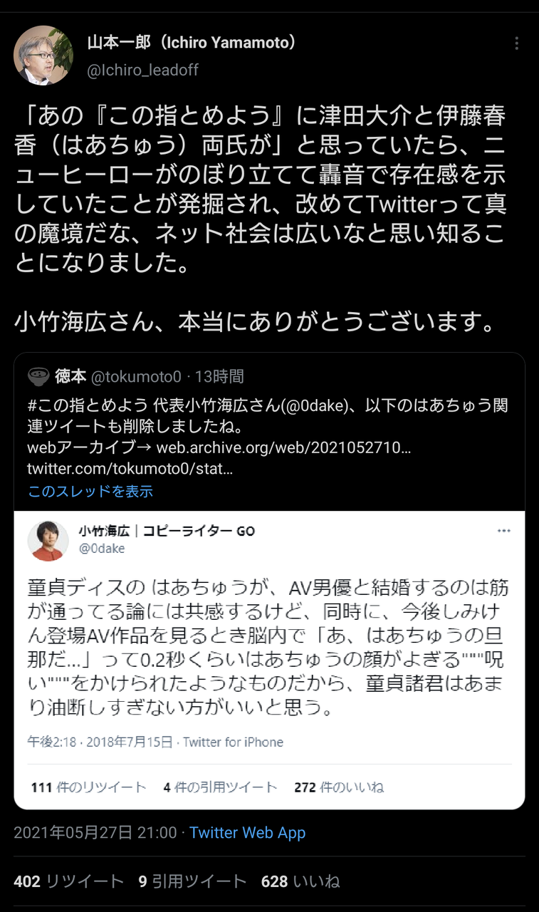 「この指とめよう 」の創設者の一人である小竹海広氏のWikipedia記事、編集履歴を見ると「ポスト平成コピーライター」というユーザーが記事を作った後何度も出典無しの記述とテンプレ剥がし編集を行ってその都度差し戻されるというのを繰り返してますね。https://t.co/pV4oQfReQB