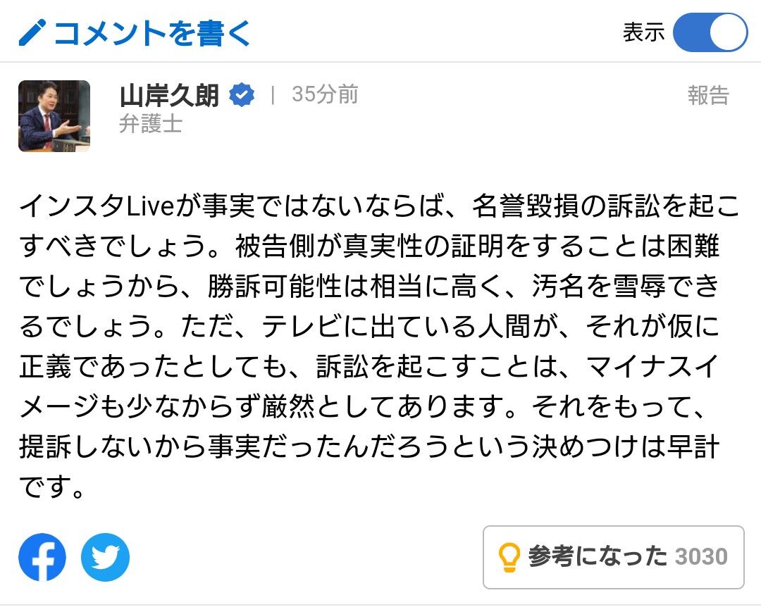 インスタLiveが事実ではないならば、名誉毀損の訴訟を起こすべきでしょう。被告側が真実性の証明をすることは困難でしょうから、勝訴可能性は相当に高く、汚名を雪辱できるでしょう。ただ、テレビに出ている人間が、それが仮に正義であったとしても、訴訟を起こすことは、マイナスイメージも少なからず厳然としてあります。それをもって、提訴しないから事実だったんだろうという決めつけは早計です