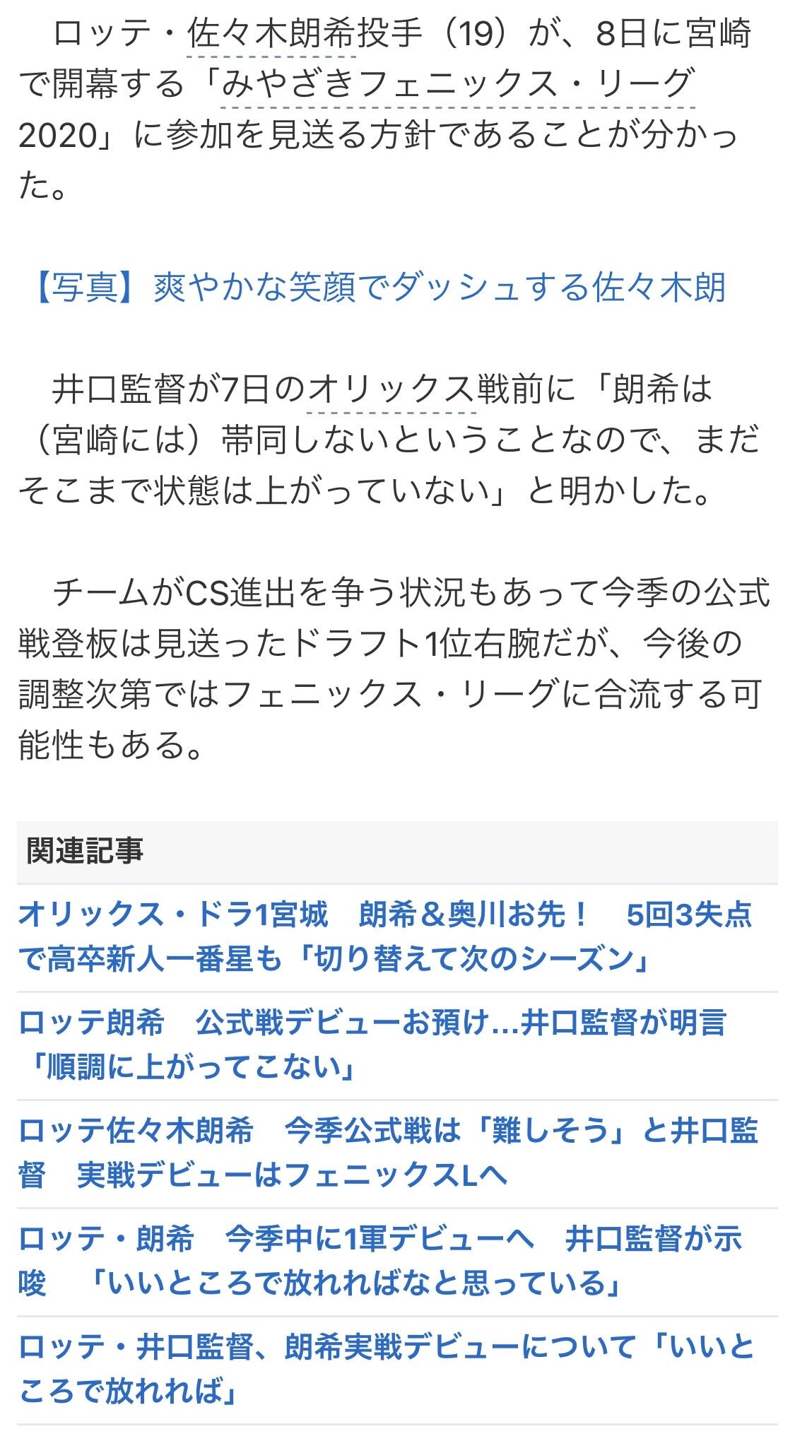 ロッテ・佐々木朗希投手(19)が、8日に宮崎で開幕する「みやざきフェニックス・リーグ2020」に参加を見送る方針であることが分かった。