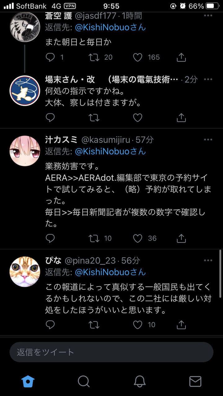 このことについて岸信夫防衛大臣は18日朝、「今般の予約に関して、朝日新聞出版『AERA dot.』記者の方および毎日新聞記者の方から、“不正な手段によって予約が取れたが、どのように受け止めているのか”との問い合わせが防衛省にあった。