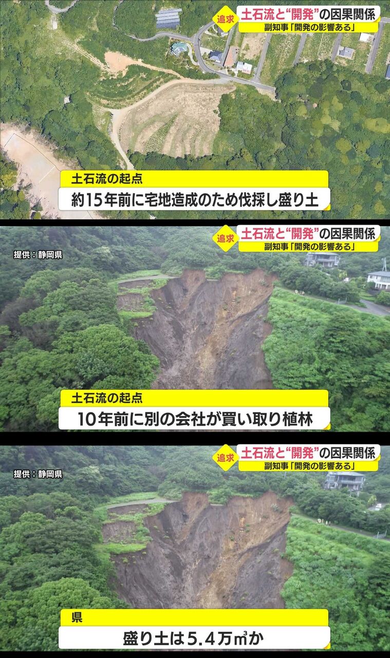 静岡県の難波喬司副知事は4日、熱海市の土石流の被災現場を視察後、土石流の発生と逢初(あいぞめ)川上流部の山林開発との関係について「開発の影響は正直に言ってあると思う。現場で見ているので、原因はかなり分かってきている」と述べた。