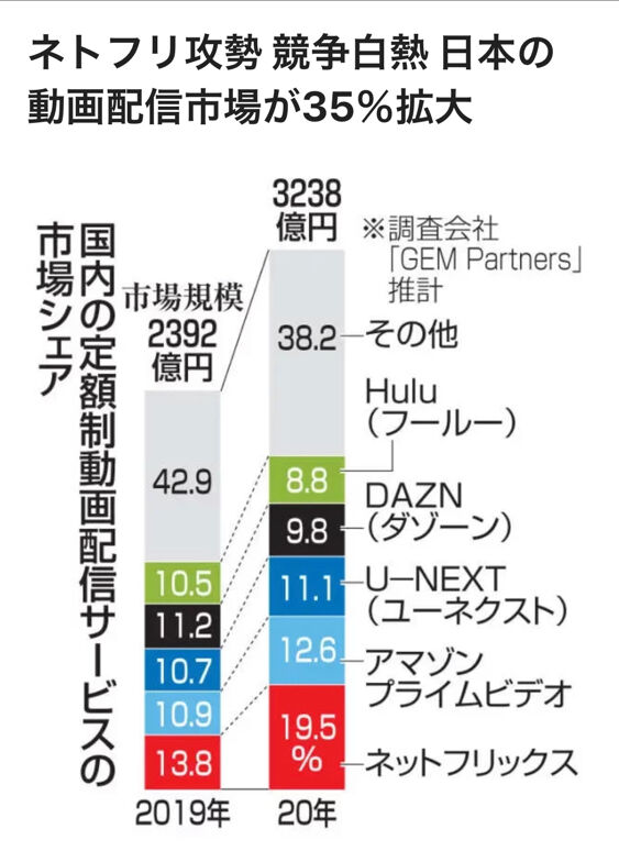 新型コロナウイルスの流行を背景に自宅で定額制の動画配信サービスを楽しむ人が増え、2020年の国内市場規模は前年比で35%拡大。独自作品が豊富なネットフリックスは、15年のサービス開始から5年で会員数が500万人を突破した。ライバルたちも作品を拡充し、競争が白熱している。
