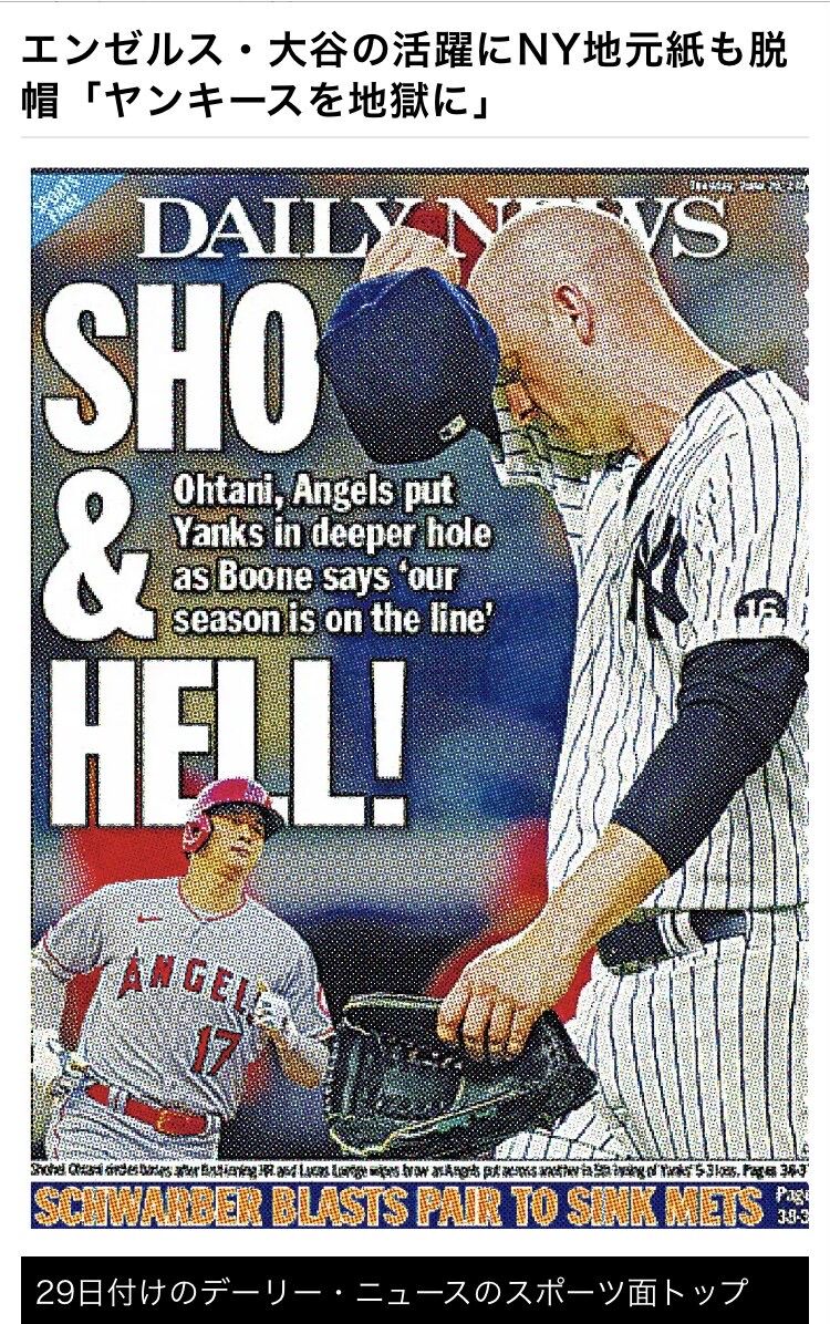 ニューヨークの地元紙も脱帽だ。17年12月のメジャー移籍の際に大谷がヤンキースを選ばなかったことに「なんてチキン(臆病者)」と辛らつな見出しをつけたデーリー・ニュースは、29日付のスポーツ面トップでエンゼルスの大谷の写真を掲載。