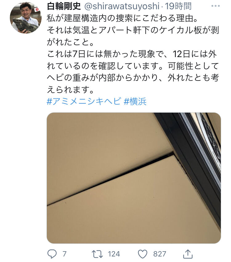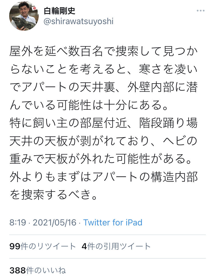 17日に飼い主宅の天井裏などを捜索したが、発見できなかった。白輪氏や管理会社、大家らがこの日協議し、アパート全部屋の壁や天井を捜索することを決めた。「まずは住民の方の協力を得て、点検口など非破壊でできる捜索をする。今週末か来週初めには早速に取り掛かりたい」と述べた。