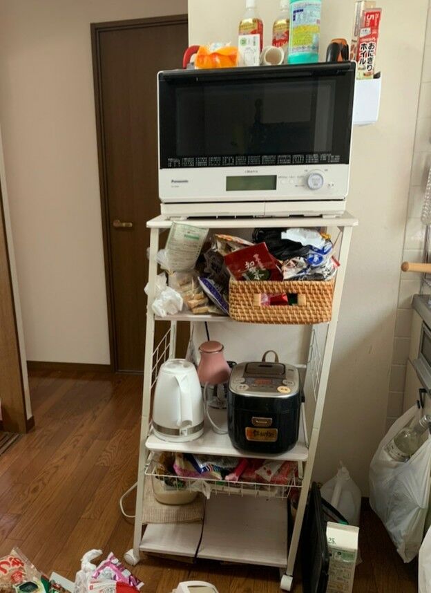 タレント小林礼奈が9日、ブログに投稿。「昨日の話」として「娘と夕飯を食べていたら突然電子レンジが倒れてしまい」と、電子レンジやジャーが乗った棚が、冷蔵庫に倒れかかり、下に食器などが散乱している写真をアップした。