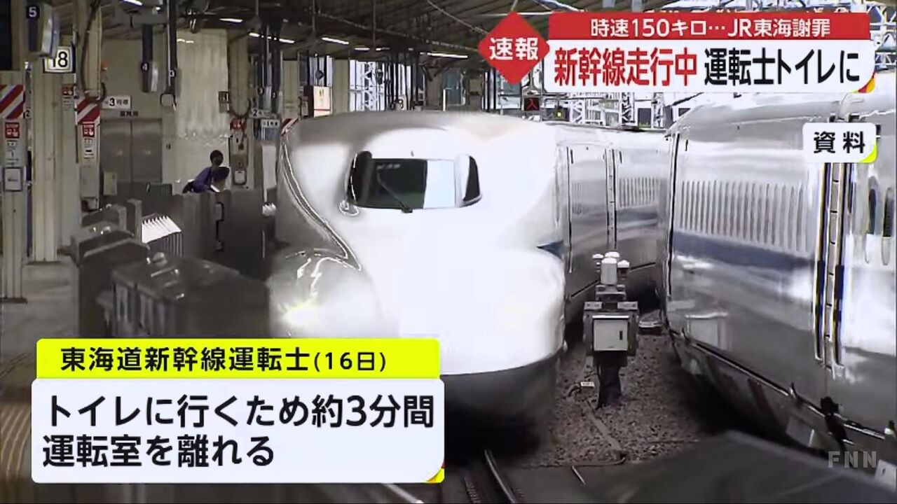 JR東海は20日、東海道新幹線の男性運転士が16日、走行中に運転席を一時離れていたと発表した。トイレに行くため約3分間、運転室を離れ、その間、運転資格のない車掌しか運転室にいない状態で、時速約150キロで走行したという。