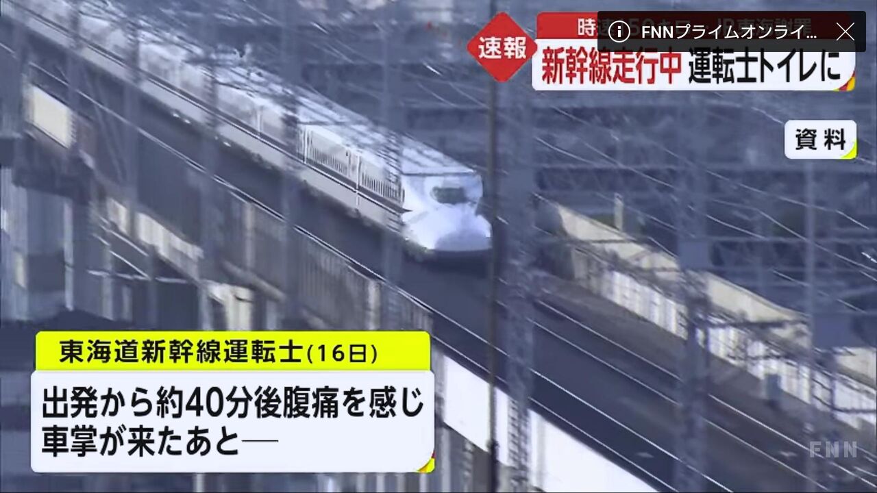 JR東海によると、5月16日、東京から新大阪行きの東海道新幹線で、出発からおよそ40分後、運転士が腹痛を感じ、車掌が運転室に到着したあと、トイレに行くため、およそ3分間、運転室を離れたという。