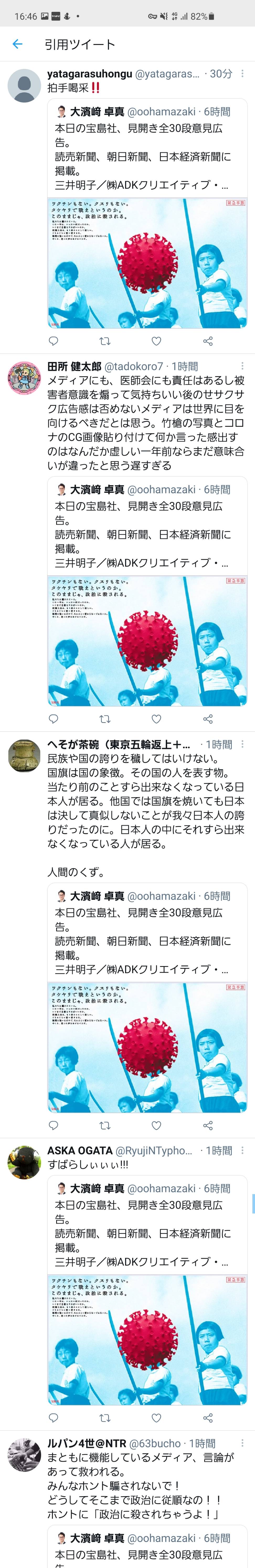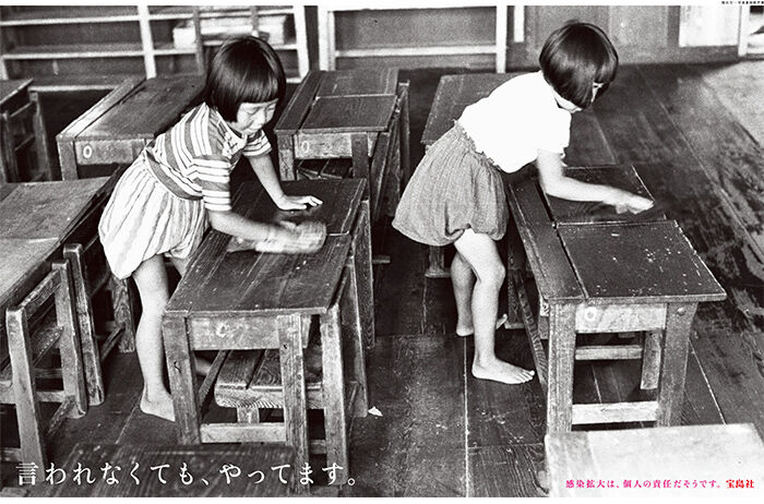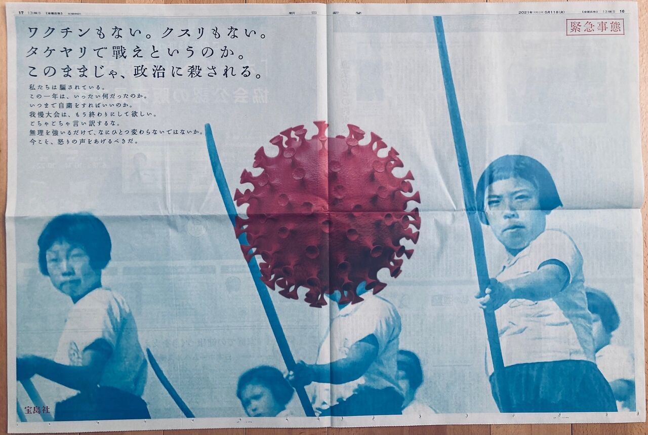 出版社の宝島社(東京都)は11日、戦時中に戦う訓練をする子どもたちの写真を背景に「ワクチンもない。クスリもない。タケヤリで戦えというのか。このままじゃ、政治に殺される。」と政府の新型コロナウイルス対策を批判する見開き2ページの企業広告を、全国紙3紙の朝刊に掲載した。