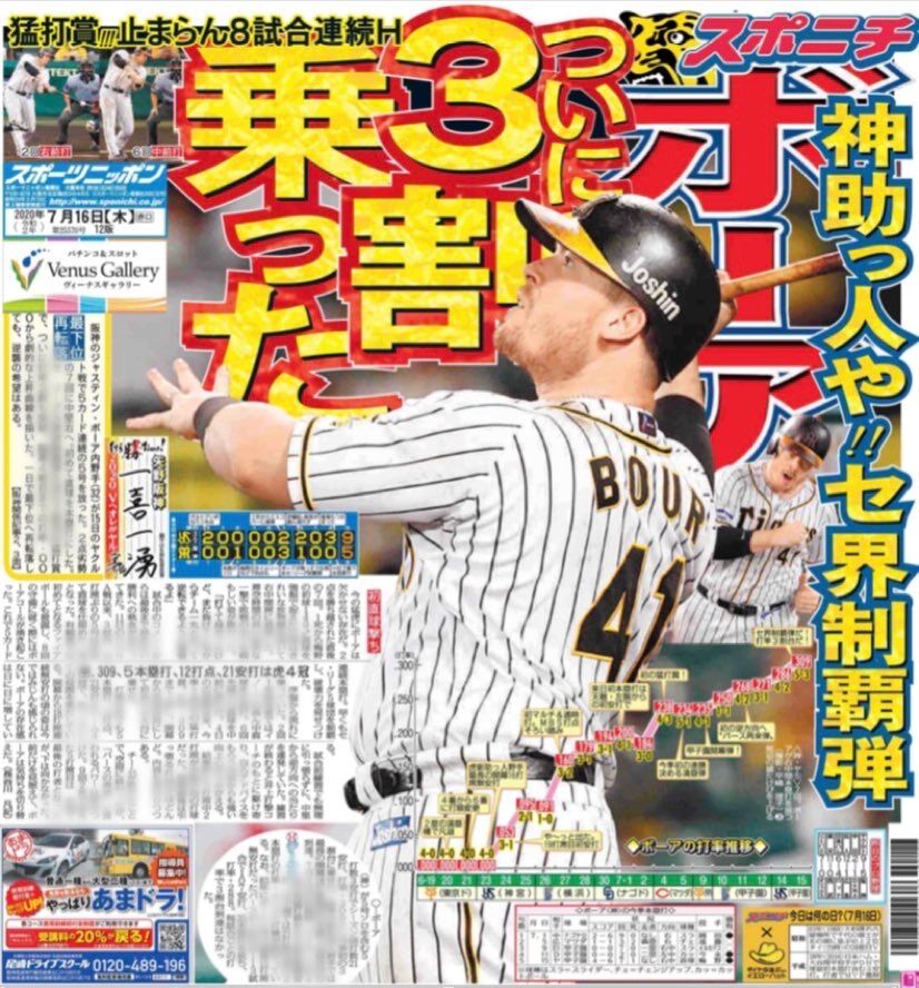 ボーアは6月後半くらいから打ち始めたけど、近本ずっと一二番なのに打たんやん