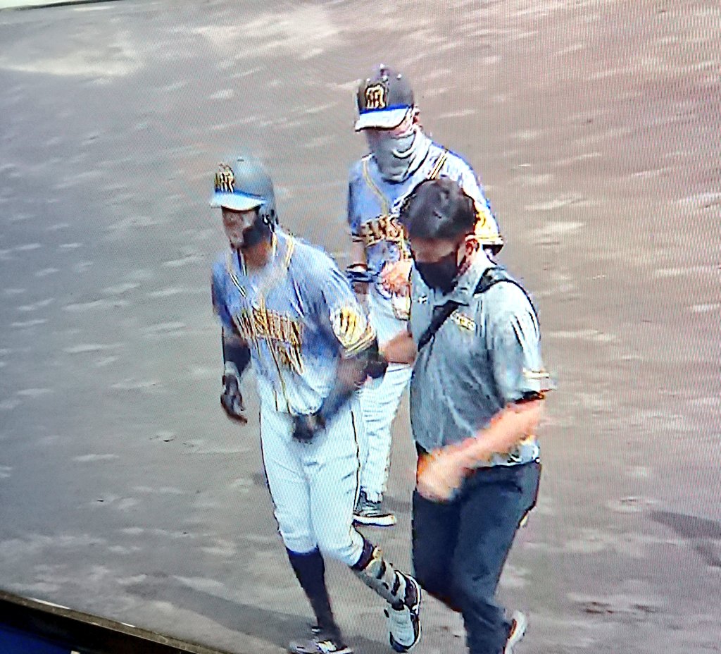 コーチとトレーナーがすぐにかけより処置。流血していたようだ。その後、自ら立ち上がりタオルで顔を押さえながらベンチへ。板山が代打に送られた。