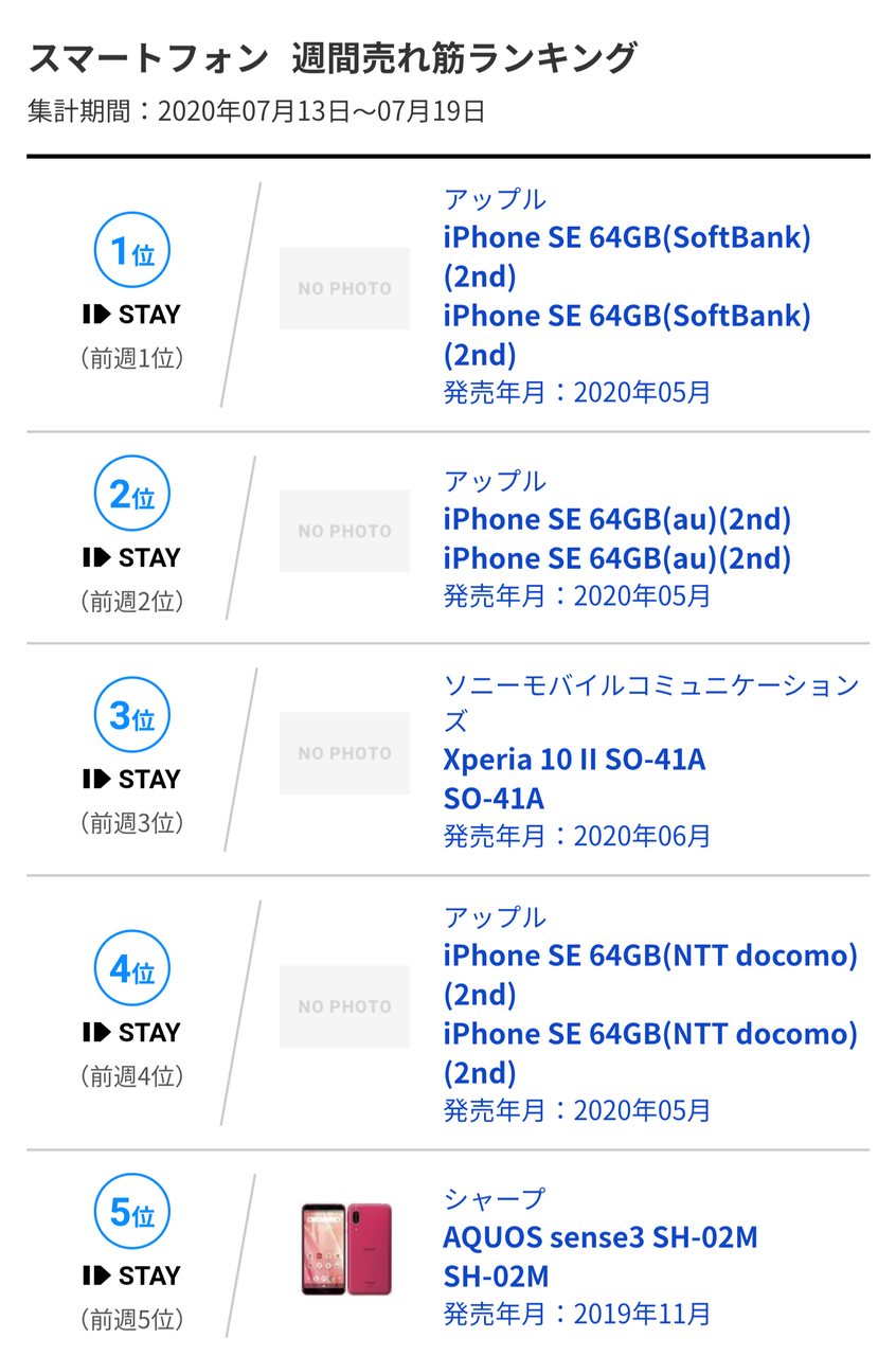 iPhoneSE、GalaxyA41、Pixel3a、Xperia10Ⅱ、Xperia1