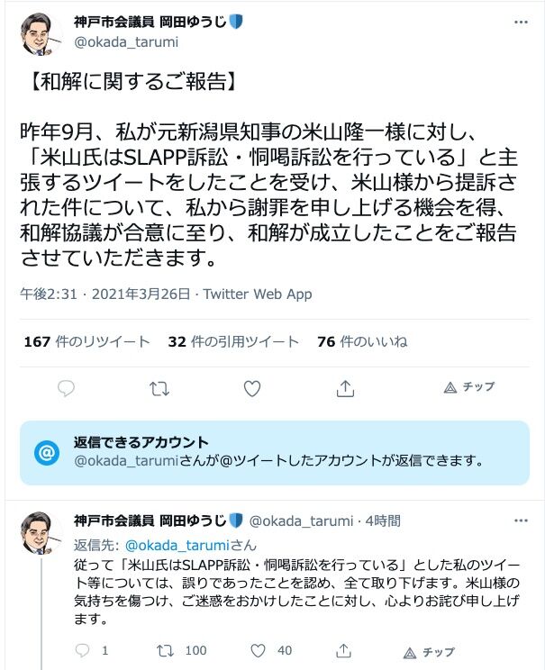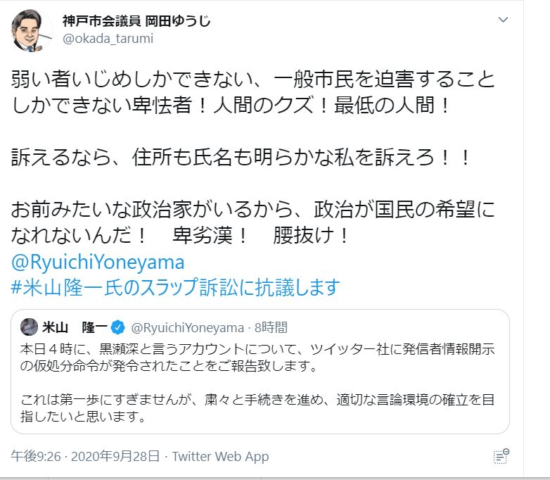 東京地方裁判所に継続しておりましたツイッター上の「黒瀬深」なるアカウントについての発信者情報開示請求訴訟において、去る5月25日にプロバイダーに対して発信者情報の開示を命ずる判決が下されておりますことをご報告致します。実際の開示・裁判はこれからですが、粛々と手続きを進めて参ります。
